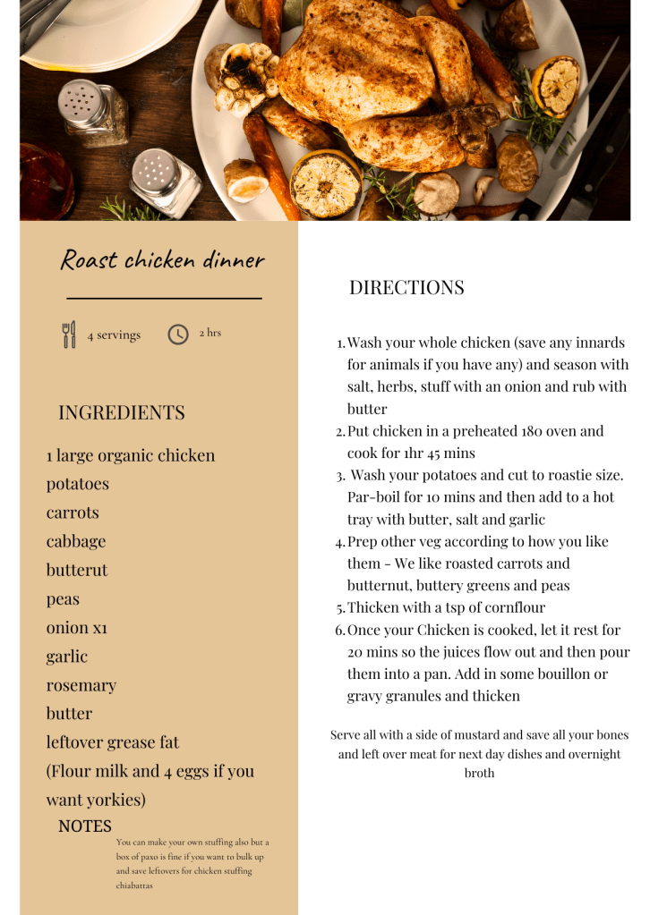 But here is our ROAST CHICKEN DINNER – You can add yorkies, whatever versatile veg you like and a homemade stock out of the juices and a couple of tablespoons of a good quality organic chicken bouillon, some wine, herbs and flour and you’re set!