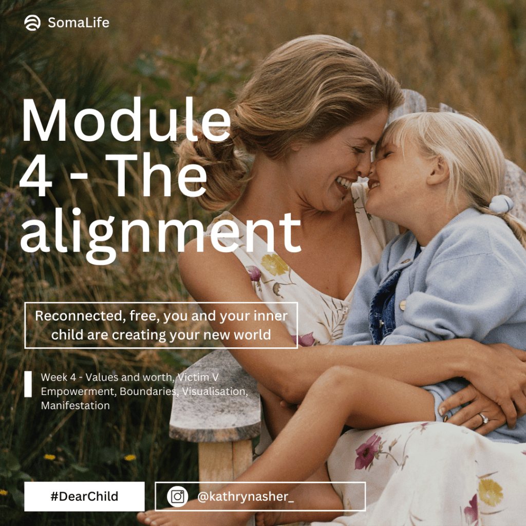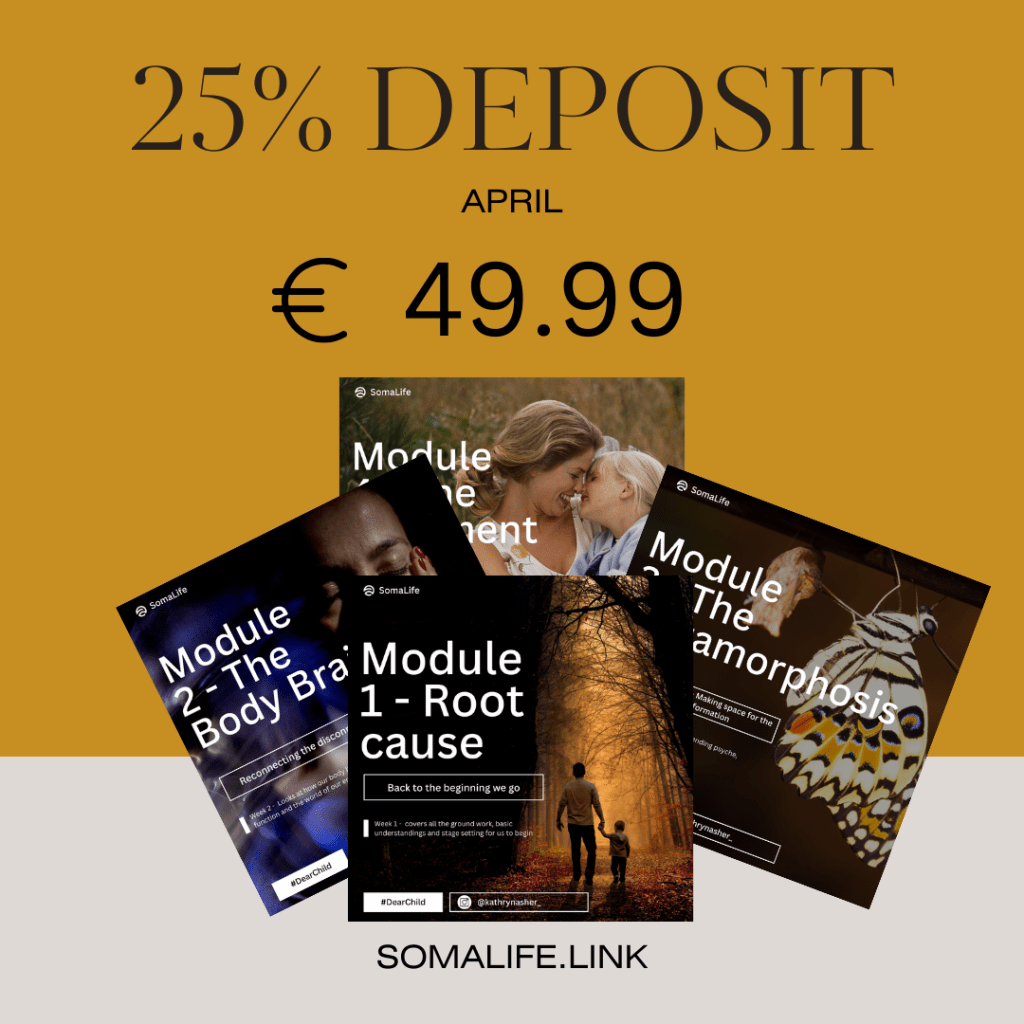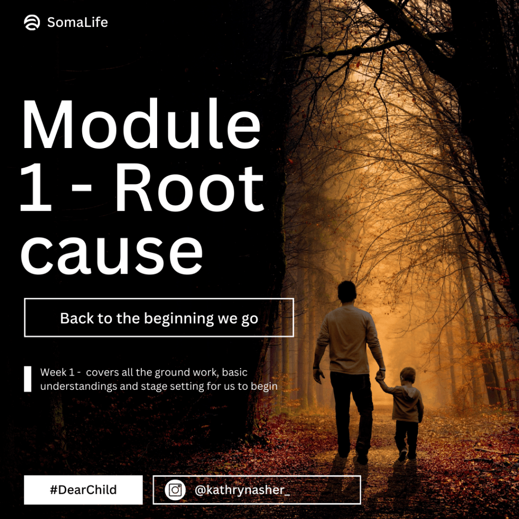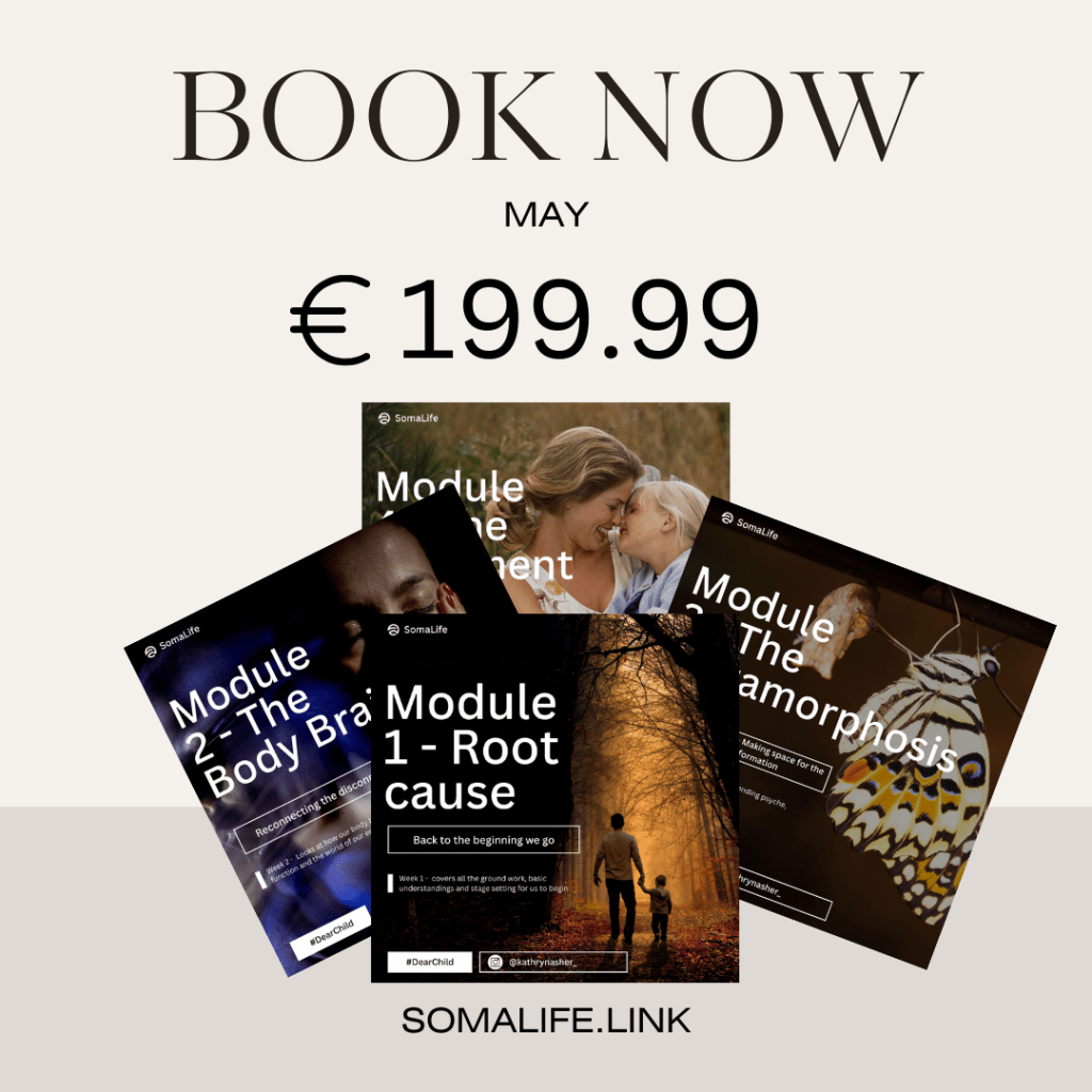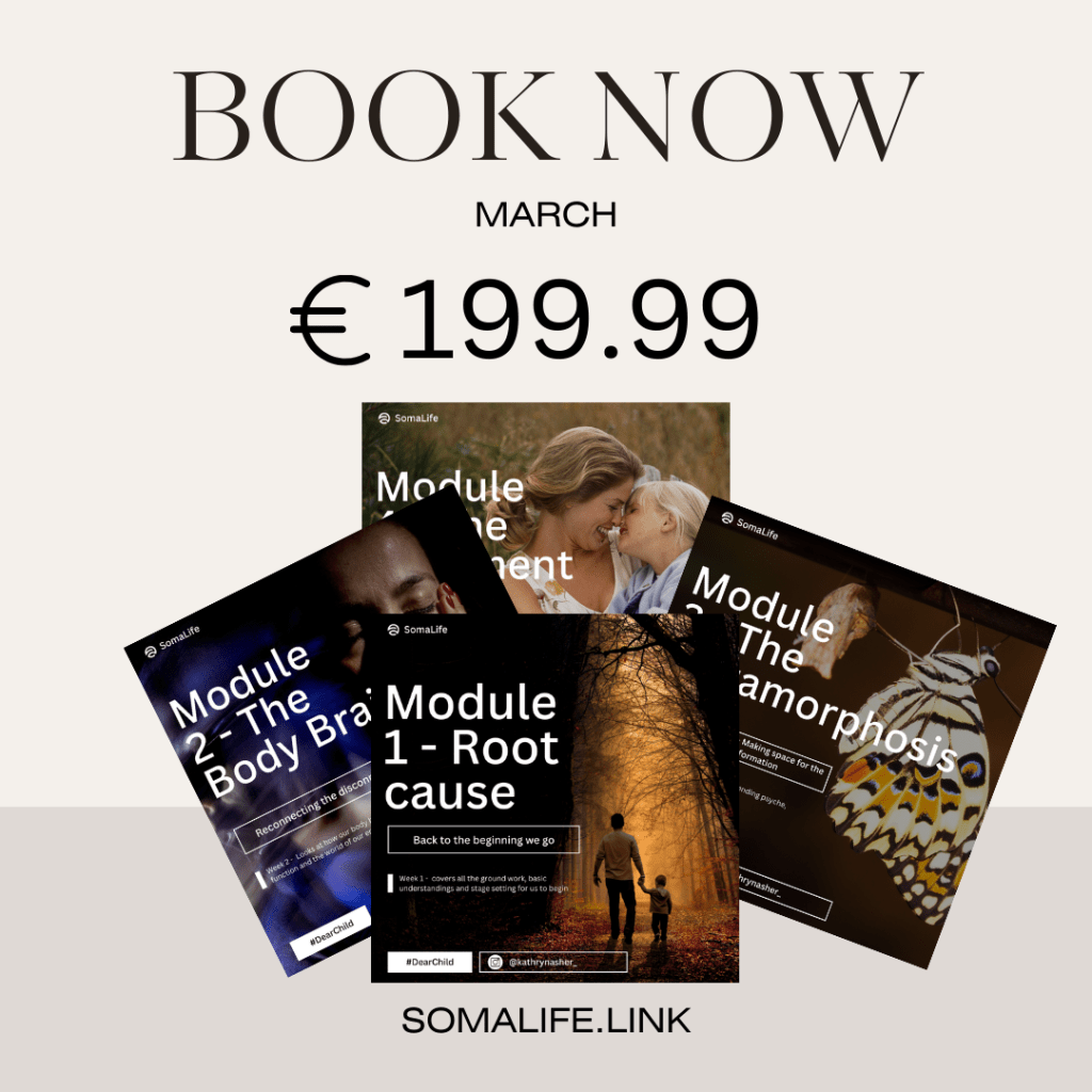We will be working through a lot of what is in the beautiful soul search book by Kathryn Asher, ‘DEAR CHILD‘ where we will explore ROOT CAUSES, behavioural loops and patterns, trauma bonding, the world of emotions and somatic embodiment and connection.