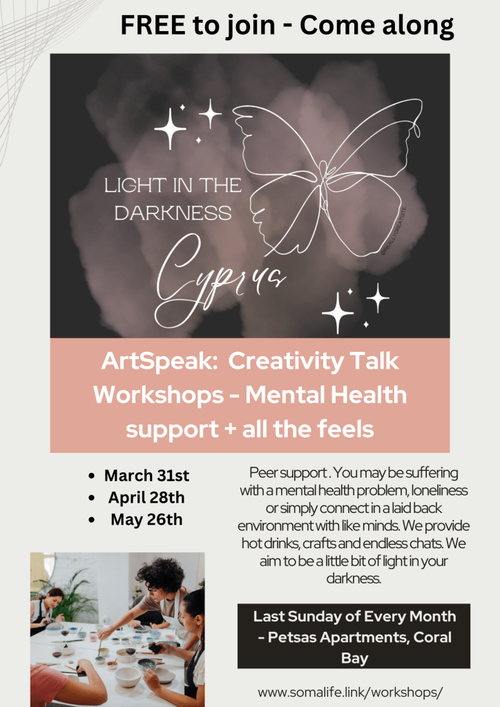 Our Cyprus based talk therapy group is called ‘LIGHT IN THE DARKNESS‘ and we are a peer support group for those struggling with mental health problems, grief, loneliness, stress, YOU NAME IT.